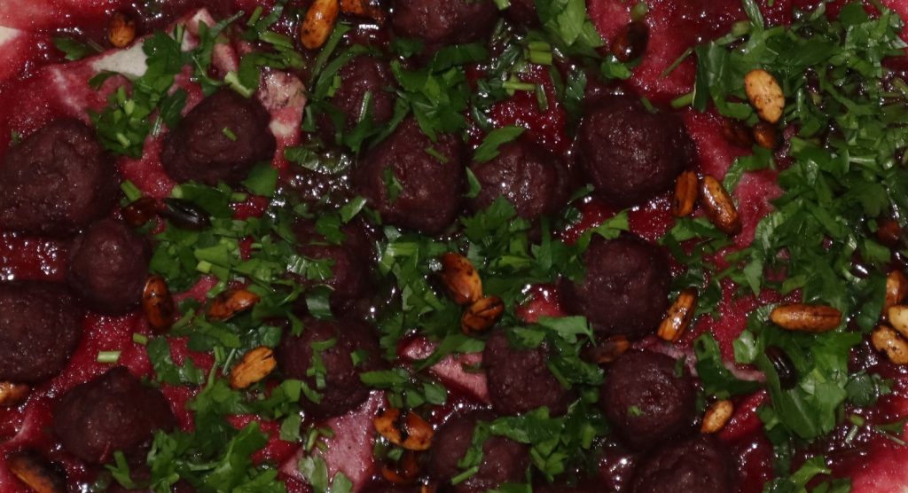 Lahme bikaraz – falafelgolyók szíriai cseresznye szószban